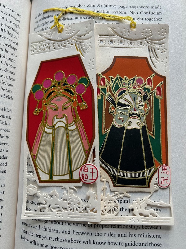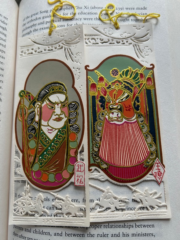 These are from a set of a dozen paper-cut bookmarks featuring masks of characters from the Beijing Opera.