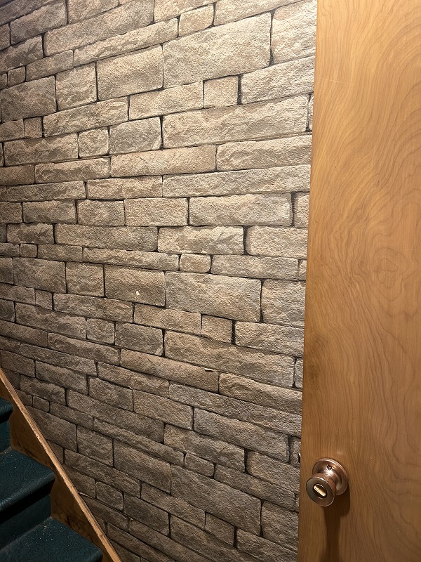 On our way down to the basement we have this lovely brickwork. But it’s not brick! It is, in fact wallpaper that looks like brick. Does this count as trompe l’oeil? If you run your hand over it, it even has a rough, pebbly texture.