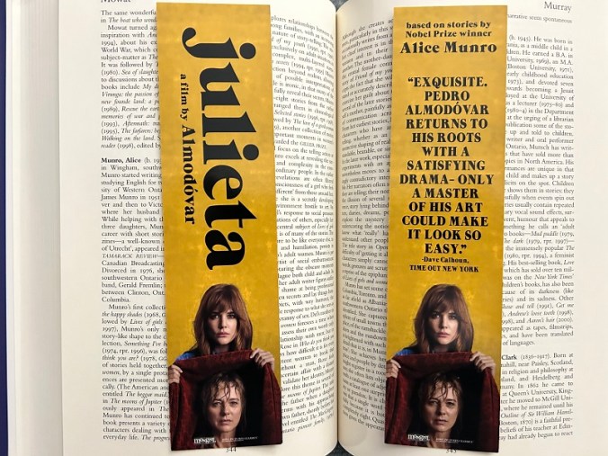 Alice Munro died this week. I know I have some Munro bookmarks, but couldn’t locate them in storage. I’m still getting my collection organized. So this bookmark promoting Pedro Almodóvar’s Julieta, a 2016 adaptation of some of the stories in Runaway, will have to do.