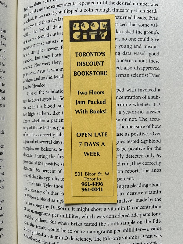 This is a bit of a fudge for my Bookstores No More series, since there are still four Book City locations open in Toronto. But this bookmark came from the original Book City store, which opened in 1976 in Toronto’s Annex neighbourhood. It’s the one I went to when I lived just down the road a bit. It was Book City’s flagship store, but closed doors in 2014. Fondly remembered!