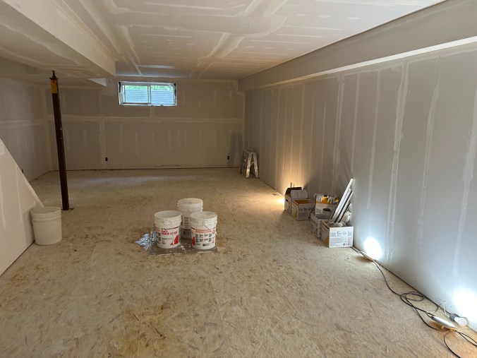 Drywall up. Were those guys ever fast! And, much to my surprise, they did a good job too. Meanwhile, mudding was a process that took nearly a week because of how long it took to dry. (You can click on the pic to make it bigger.)