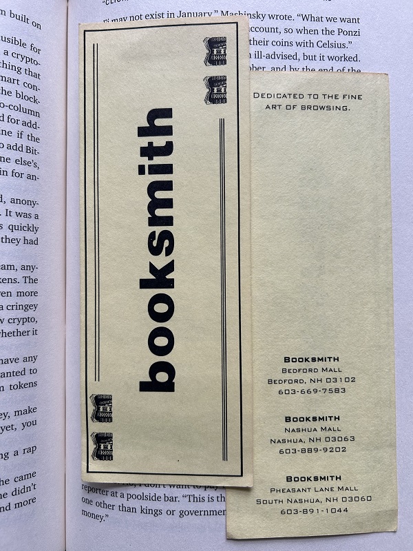 There are several bookstores named Booksmith that are still going. I think the most famous one may be in San Francisco. But I picked up these bookmarks on my one and only trip to New Hampshire in 1996, and I don’t think this particular Booksmith, which had three locations at the time, is still in existence. At least that’s what I’m given to understand by my sources on the ground in the Granite State. Which leads me to believe that this particular Booksmith is a Bookstore No More.