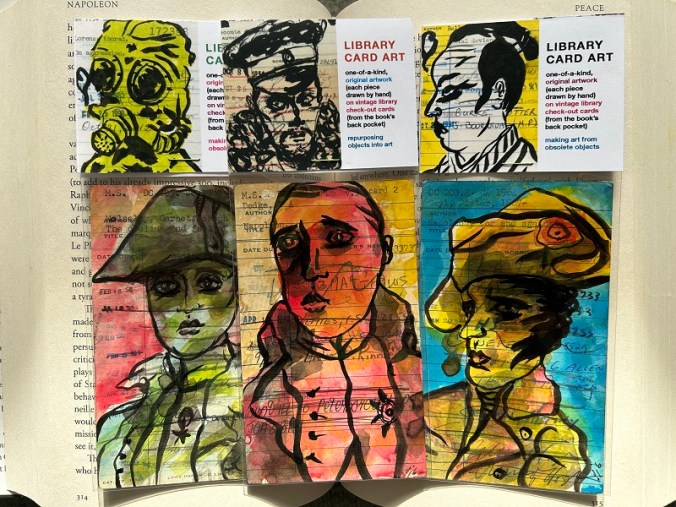 I had an earlier Bookmarked! post featuring some of the library card art of Darryl Berger (“making art from obscure objects”). These three bookmarks are another set, being three different portraits of Napoleon painted on library cards of books about Napoleon. Love the concept and the execution. Great stuff!