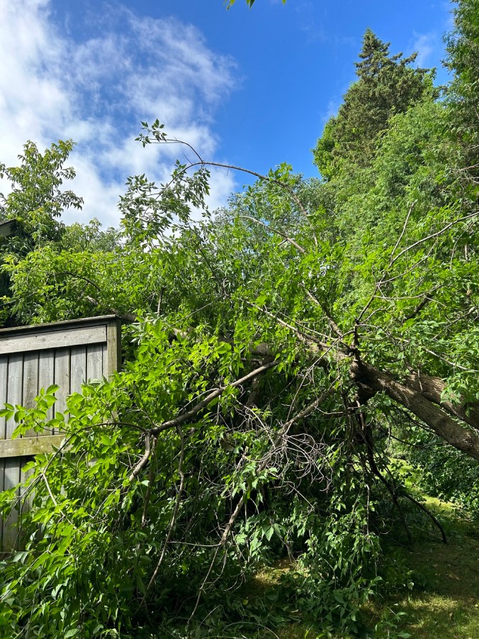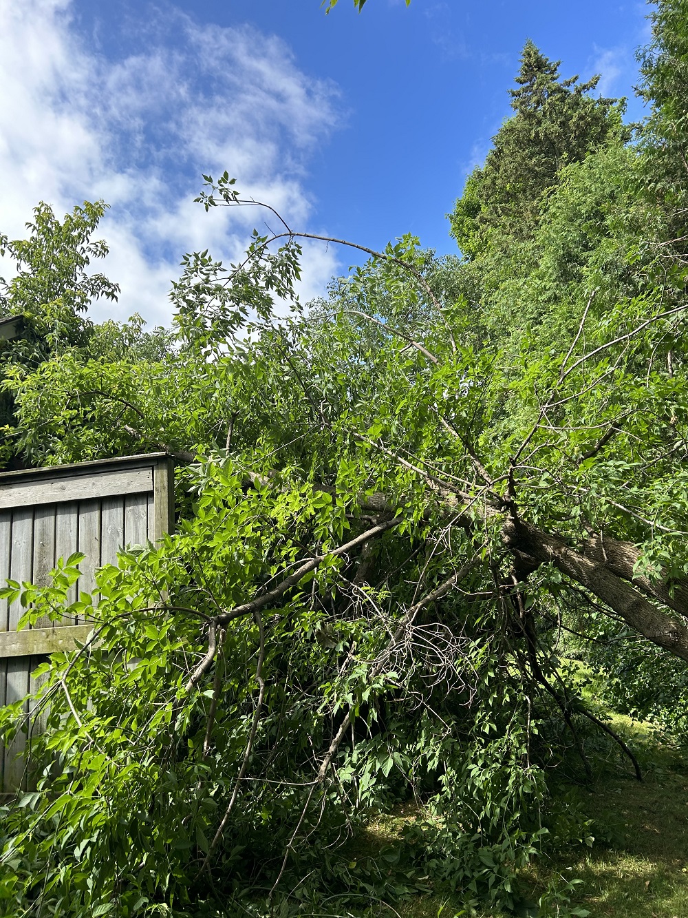 So two nights ago we had a whale of a storm here, with the eavestroughs overflowing and lightning flashing non-stop for about twenty minutes. The next morning I saw some trees had come down, including this on my next-door neighbour’s porch! Luckily the deck took most of the impact and no windows were broken and there were no holes in the roof. I’m always afraid something like that is going to happen to me as we have a lot of trees back there. Near miss!