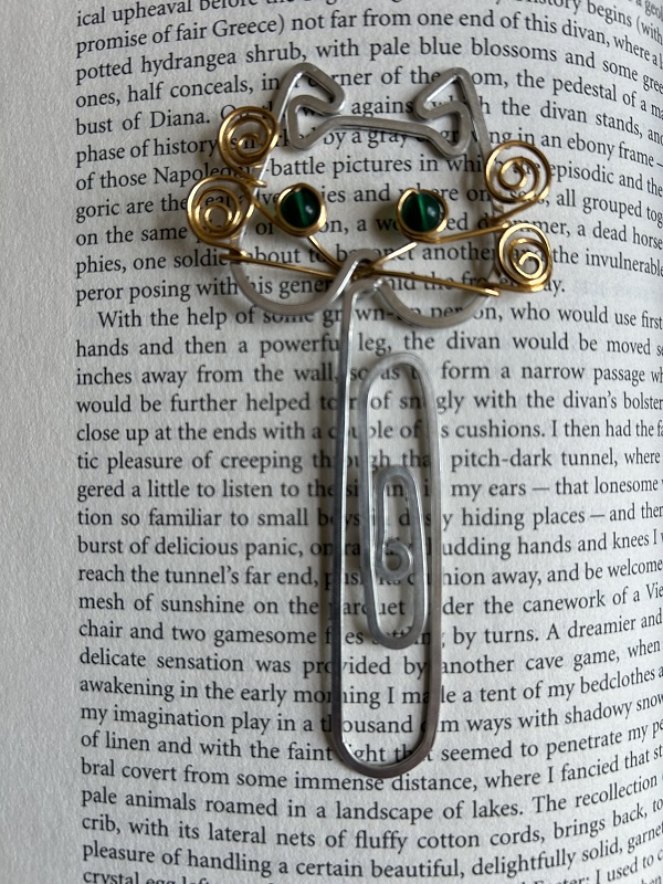 Another cat bookmark! I’ve had several of them here, though I haven’t lived with a real cat in forty years. This handmade paper-clip cutie comes from the studio of Heather Boyd in Montreal.