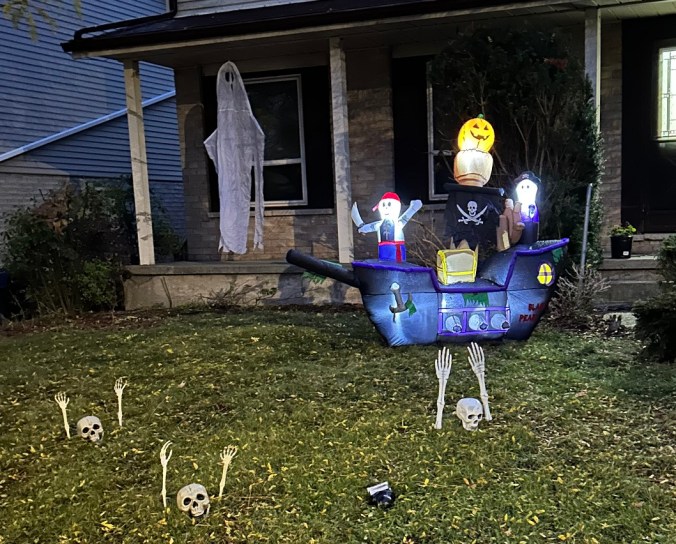 Halloween is coming up this week. These inflatable lawn decorations seem to be all the rage. I did a post on one of the more excessive last year. Here are a couple of others I saw yesterday morning. I like the pirate ship with the skeletons overboard. (You can click on the pics to make them bigger.)