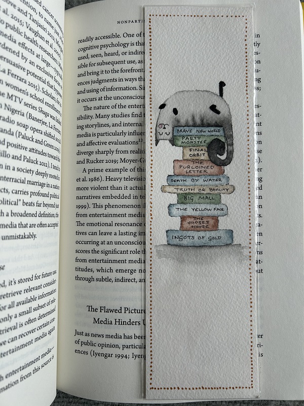 A very special bookmark this week from the fabulous Fraggle! It’s a handpainted comic scene with a feline taking a catnap on top of a pile of books (which I’ve reviewed). Not a very comfortable perch for that kitty, but they always seem to make do.