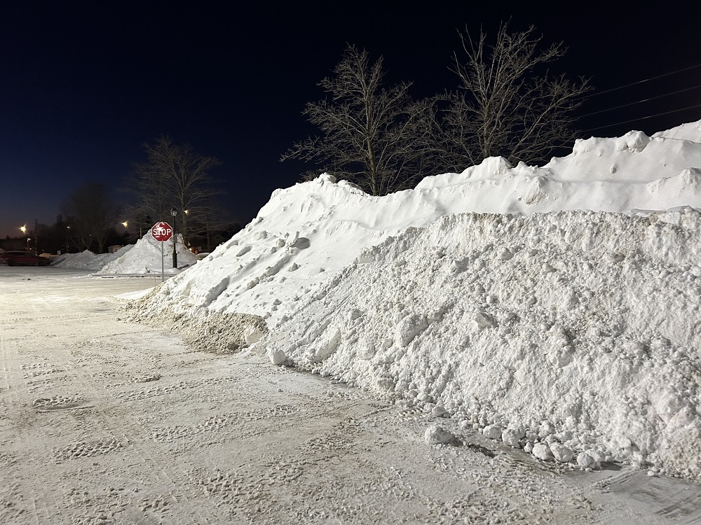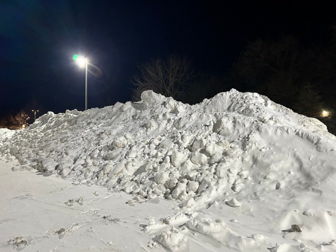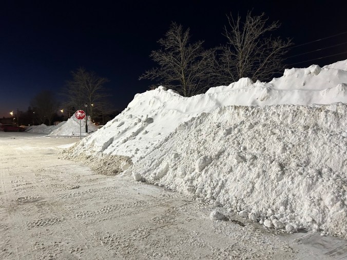 Once the plows have built up these piles of snow in parking lots I always wonder how long they’ll last. We’ve had a fair bit of snow this winter, with more on the way, so I suspect these will hang around a while. I walk past the top one every day so I’ll try and report back. I suspect some of it will still be there well into April.