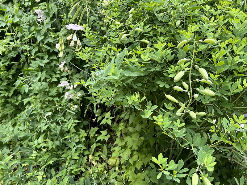 In my last gardening post I made a passing reference to my garden’s “green wall.” This occurs at the point in the summer when the ivy has made a solid wallpaper effect, the blue false indigo (identified by an elite horticulturalist in the comment section here) is no longer in bloom, and the sweet pea vine is filling its pods, with only a few blossoms remaining. It’s green on green on green, in what I think is a wonderful mat of life.