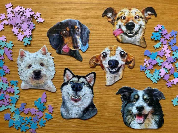 This was a neat little idea. There were a dozen mini-puzzles in the box, each an irregular shaped picture of a dog making a funny face. (They call them “selfies” even though I don’t think the dogs were taking the pics.) Each mini-puzzle has a different colour of backing, so you can sort them out before you get started, or just try to do them with all the pieces jumbled together.