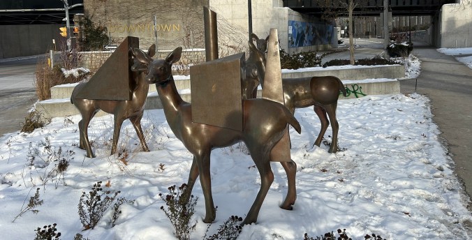 I often walk past these deer when I go downtown but I’ve never taken a picture because they’ve had paint on them or stickers. I guess they got cleaned up at some point so I took their picture yesterday. No, I don’t understand the meaning of the geometric forms. And yes that’s my shadow on the deer closest to you. I didn’t realize I’d put myself in the picture until I got home. (You can click on the pic to make it bigger.)